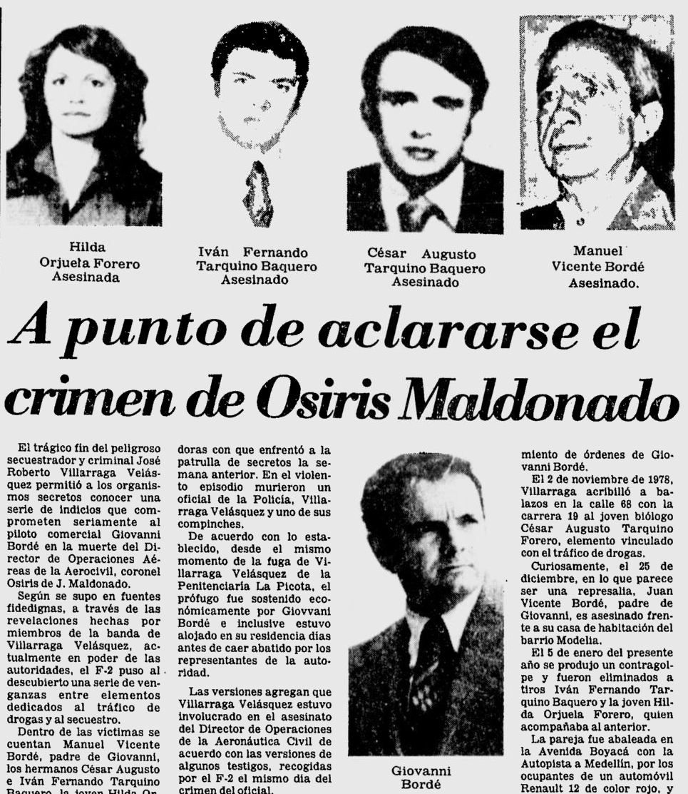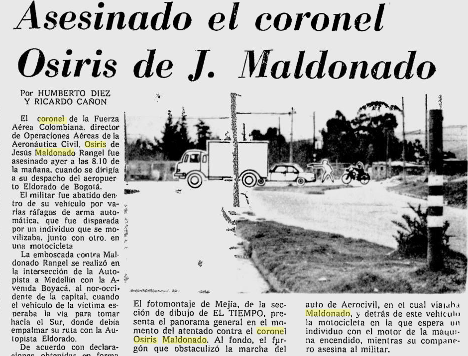 La lucha contra el narcotráfico en Colombia durante la década de 1970 dejó una estela de crímenes sin resolver que involucraban a altos mandos políticos, militares y civiles. Uno de los casos más emblemáticos y controversiales fue el asesinato del Coronel retirado de la Fuerza Aérea de Colombia Osiris de J. Maldonado, director de la Aerocivil, ejecutado mientras iba en su vehículo rumbo al Aeropuerto El Dorado en 1977. Las pesquisas apuntaron hacia redes del narcotráfico, secuestradores y los propietarios de una aerolínea privada, pero el caso terminó archivado en la impunidad.