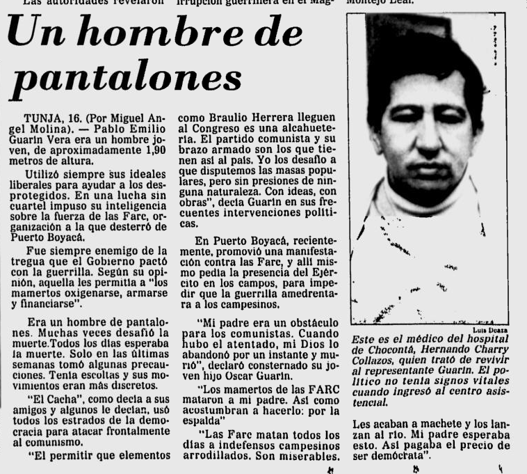 El artículo de 1987 "Un hombre de pantalones", publicado tras el asesinato del prapolitico liberal Pablo Emilio Guairán Vera por las FARC, para develar los mecanismos narrativos que persisten hasta hoy en la cobertura mediática del conflicto.